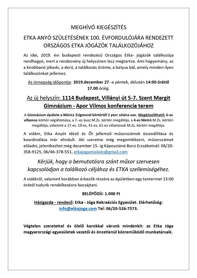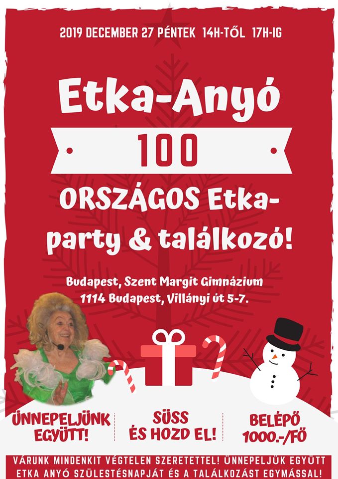2019. december 27-én kerül megrendezésre Etka Anyó születésének 100. évfordulója alkalmából az Országos Etka Party és Találkozó Budapesten.