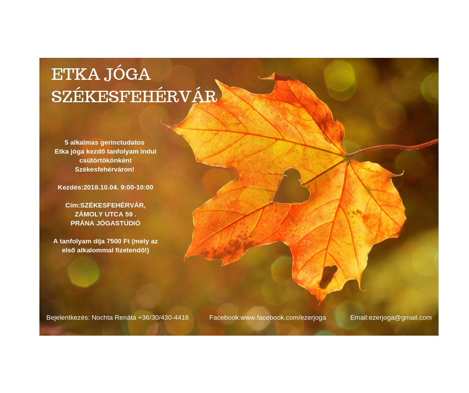 2018. október 4-én, csütörtökön kezdő Etka-jóga tanfolyam indul Székesfehérváron.A részletek itt találhatóak!